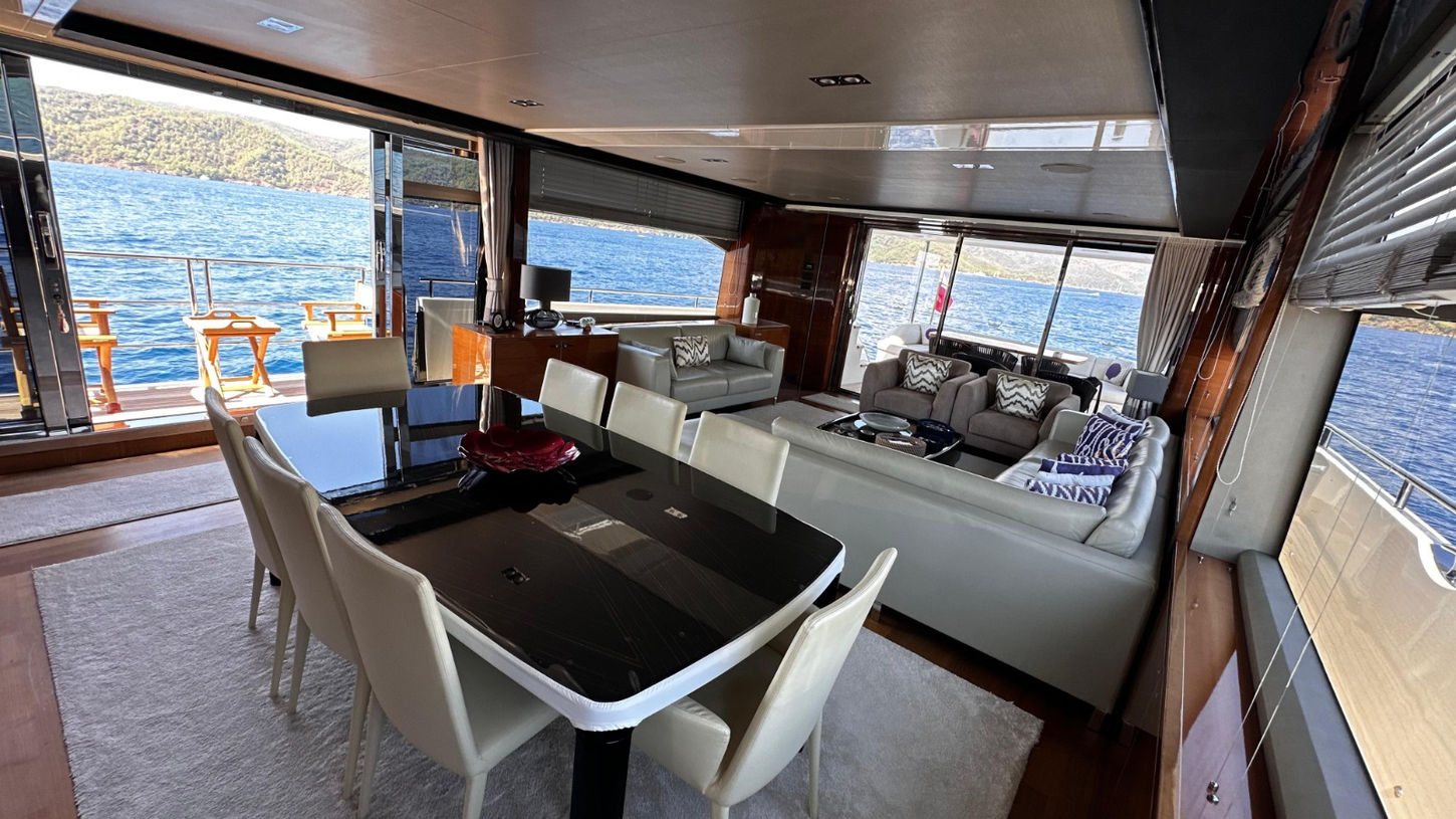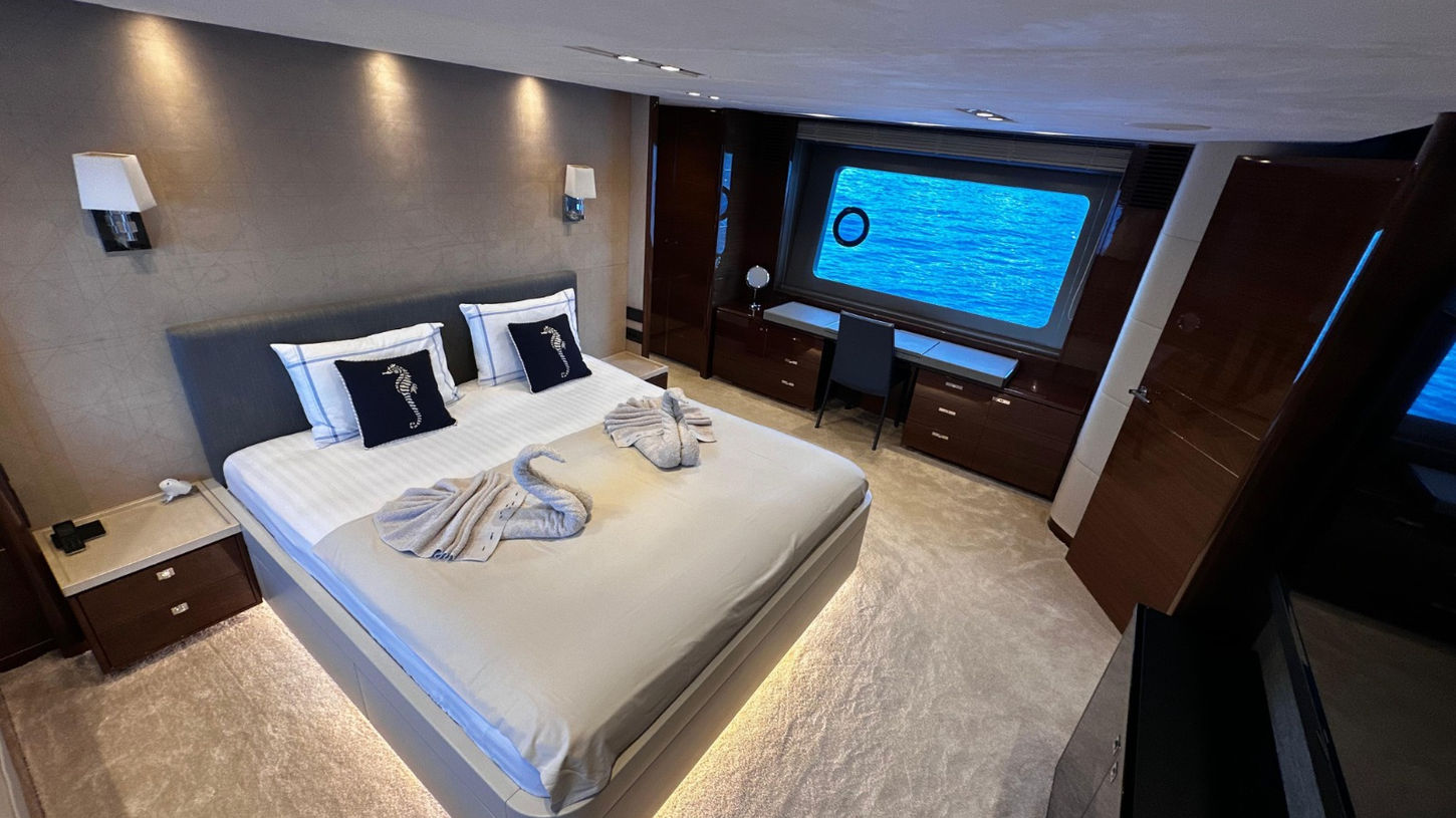 The 26.85-meter Princess 88 blends British design excellence with refined luxury. Panoramic windows fill the interiors with natural light, while four guest cabins and a large flybridge enhance comfort and social life. Efficient hull geometry ensures long-range, smooth, and secure cruising.